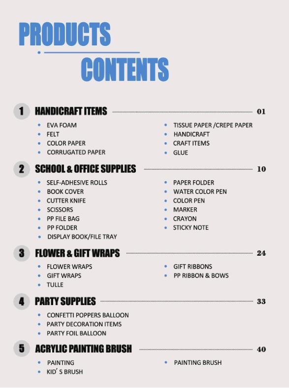 Pusimos al día nuestra lista de los nuevos productos. Las series de los productos inluding la flor y los papeles de regalo, los artículos de la artesanía, los proveedores del partido, escuela y los materiales de oficina y cepillo de pintura arcylic. Nuestros productos principales son papel de ...